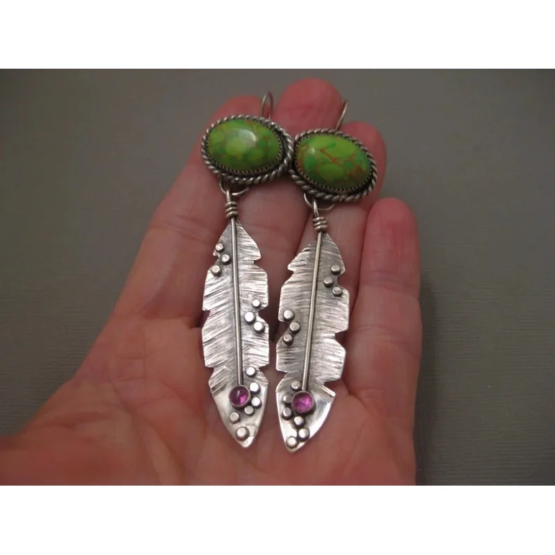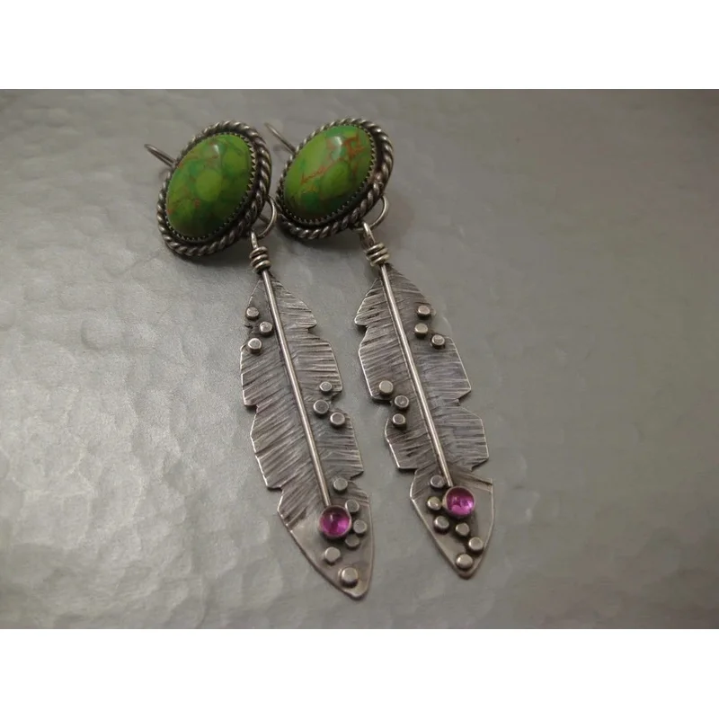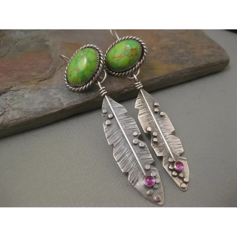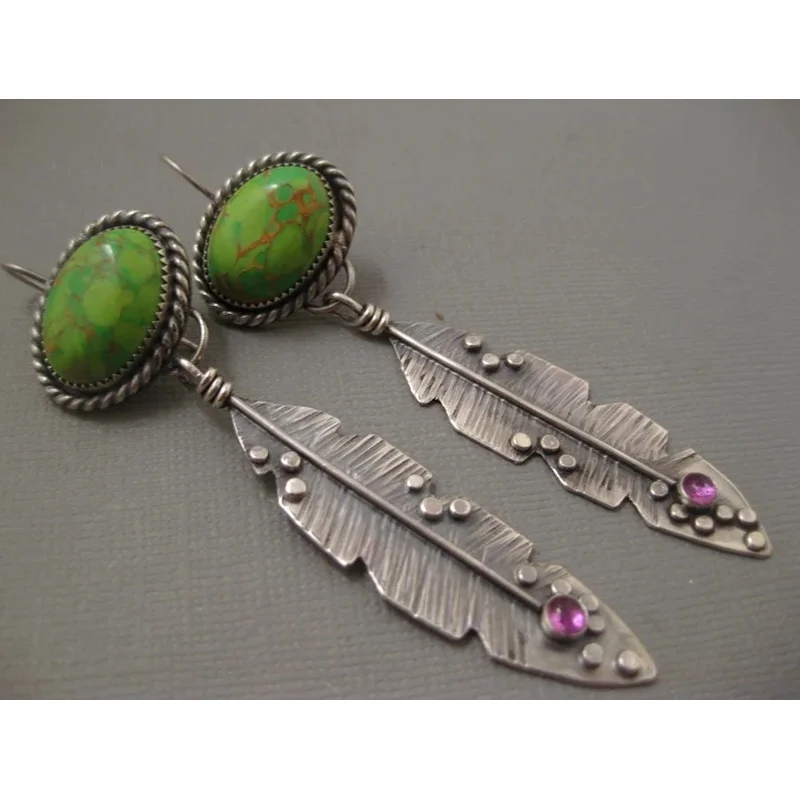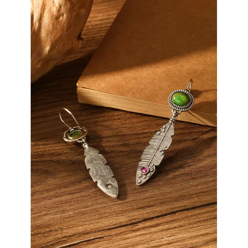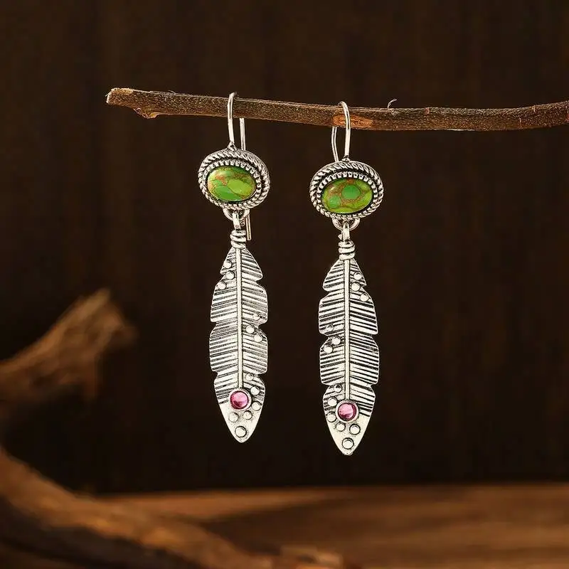 Vintage Ethnic Oval Green Stone Earrings Original Metal Carving Leaf Pendant Earrings Suitable for Women's Jewelry